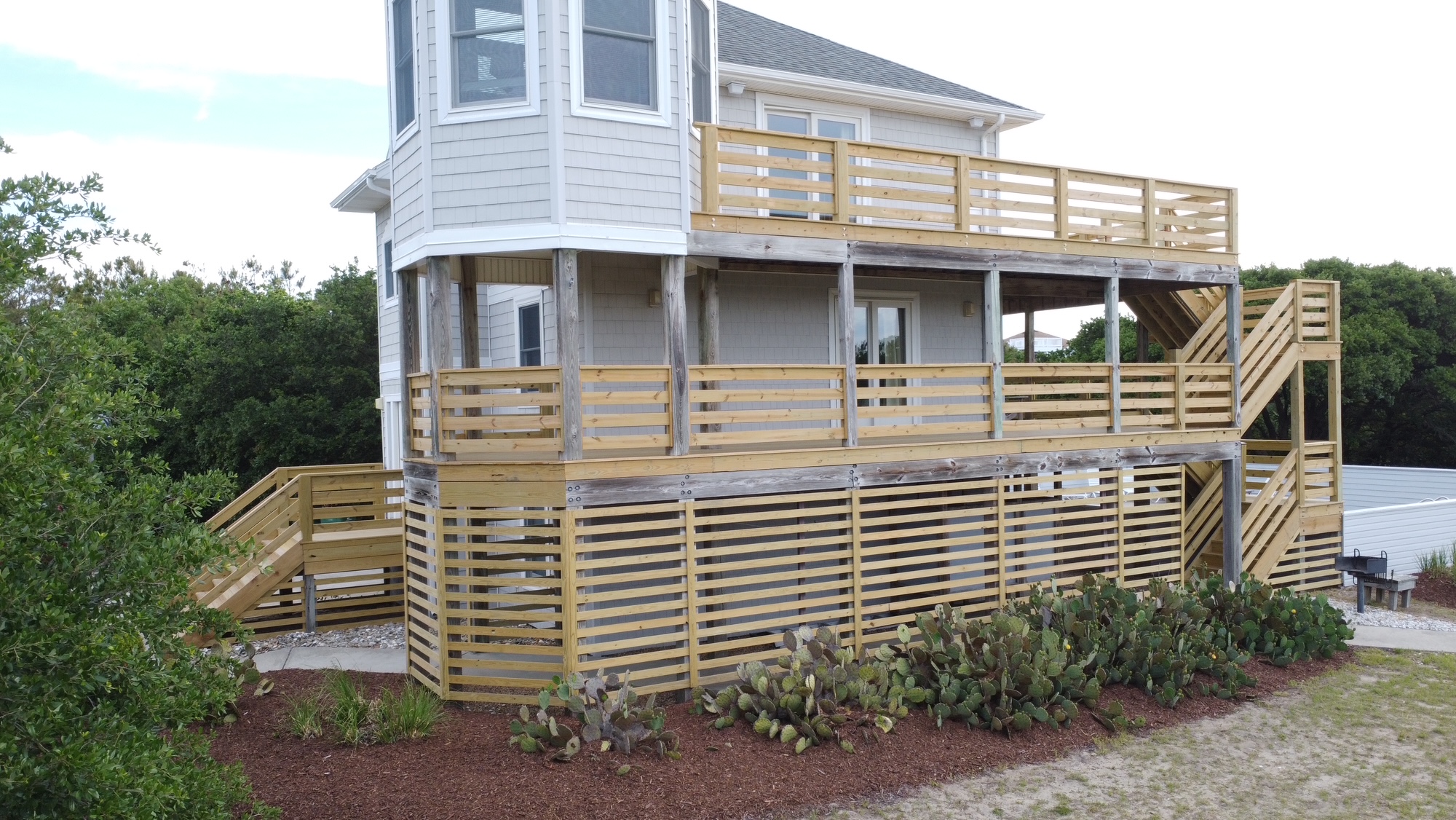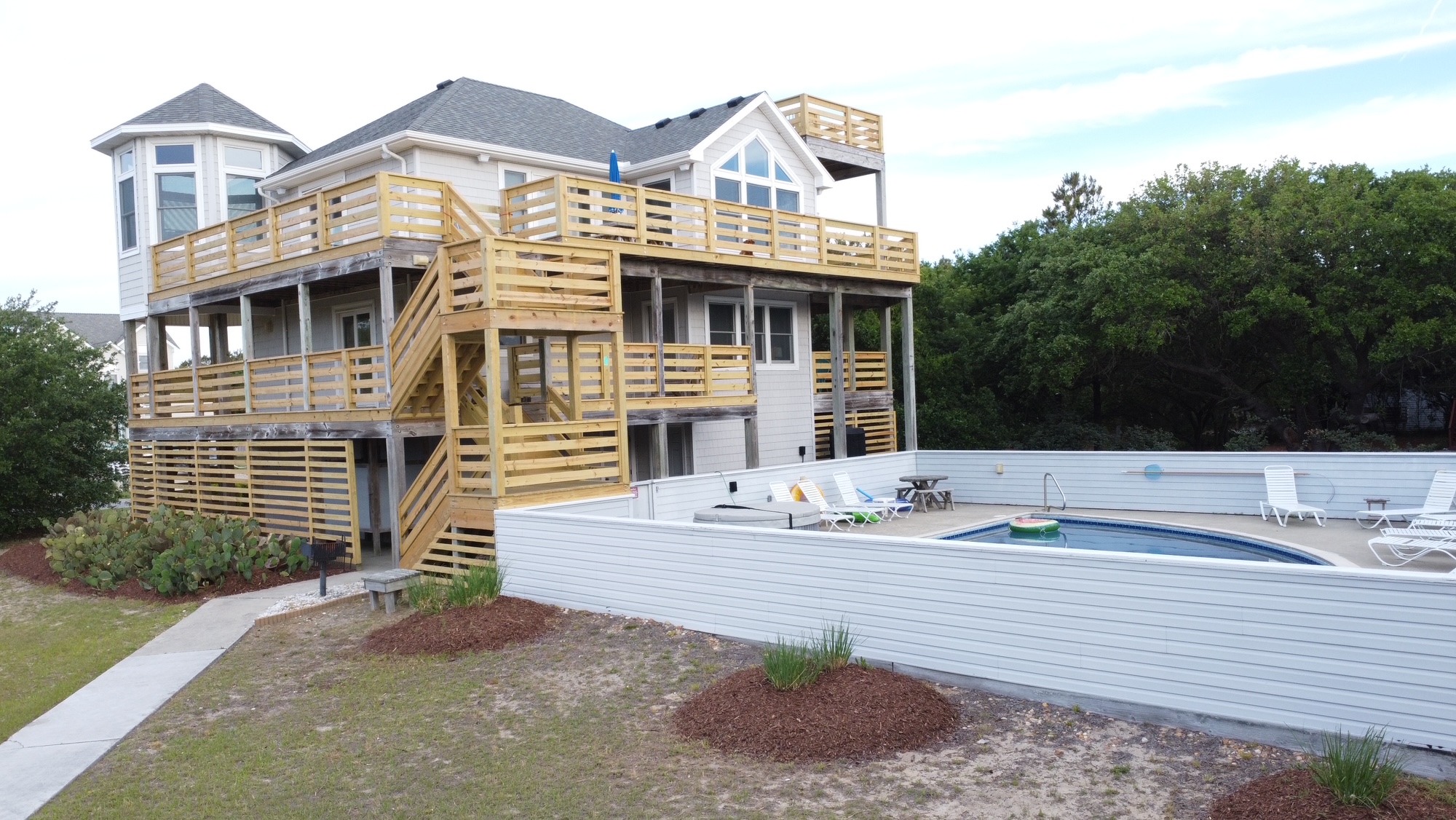 Step outside and you will see uniqueness goes beyond the tower. The arc-shaped pool is the center of attention of the fenced-in back yard. There are plenty of lounge chairs to let you bask in the sun, and a hot tub awaits you for that long relaxing soak. Outside in the yard, a park-style barbecue grill is ready for your grill masters and horseshoes await you for some healthy competition amongst your group. Adjoining the property is a formally constructed walkway that gets you to the beach with a short walk that is less than 200 yards.