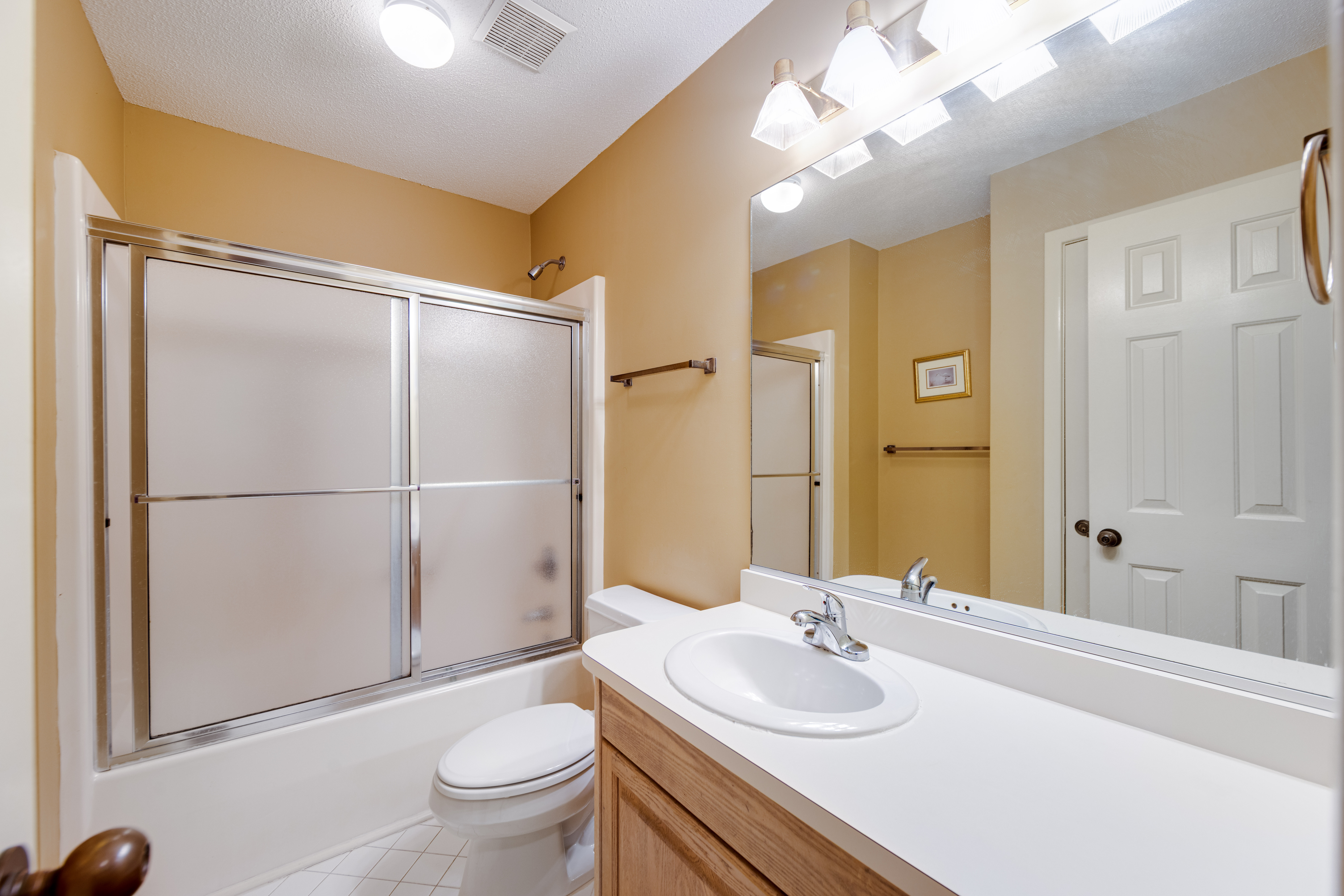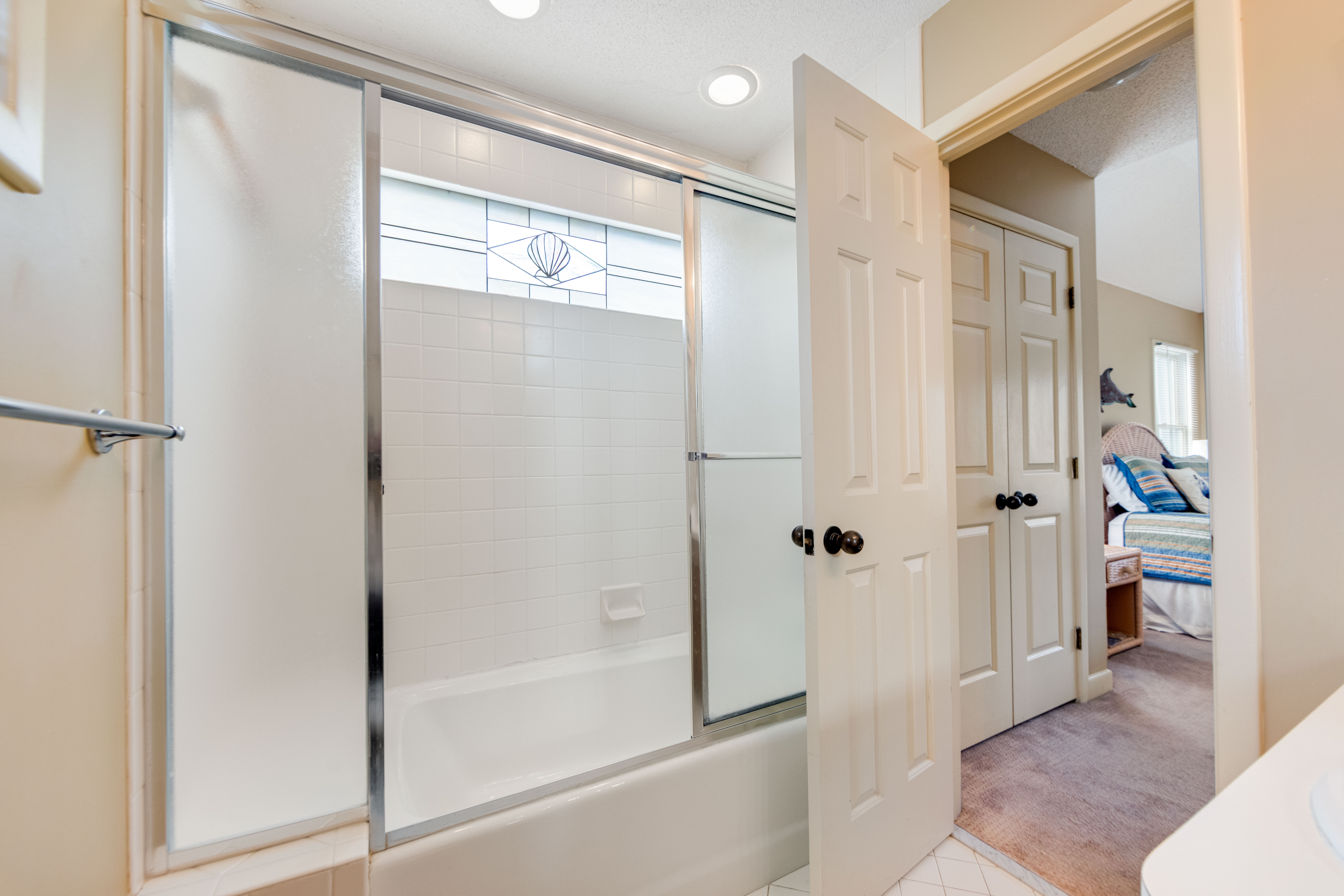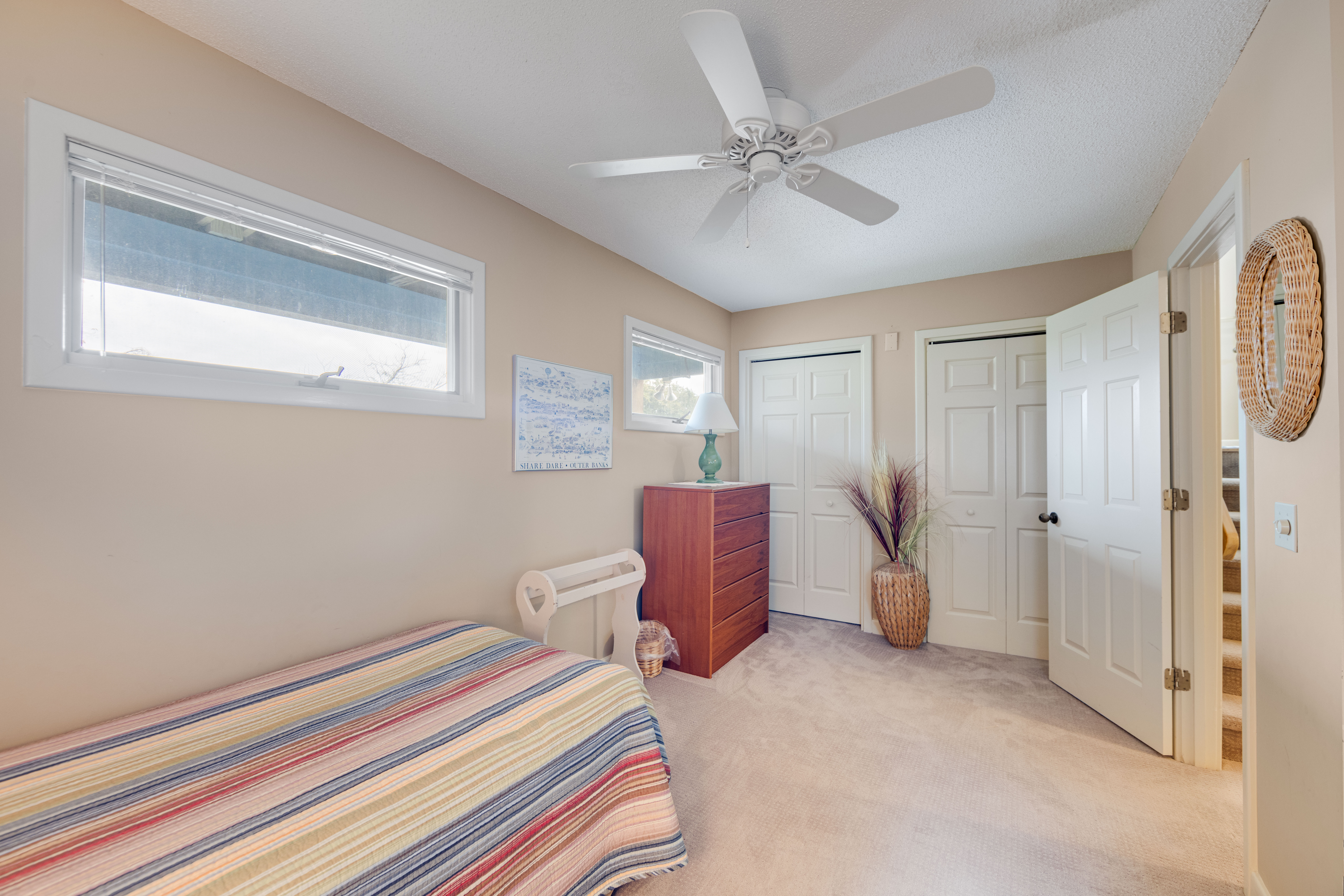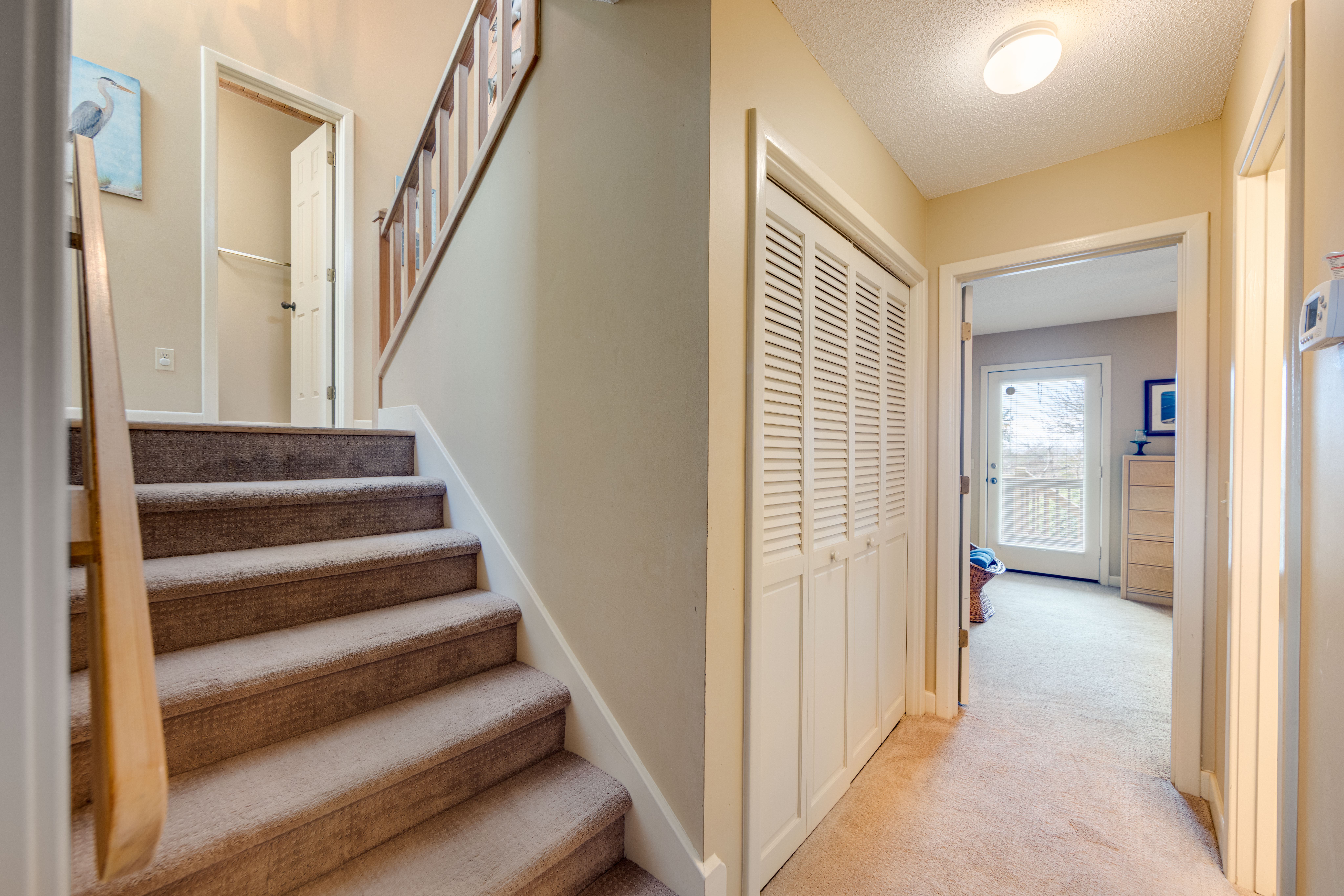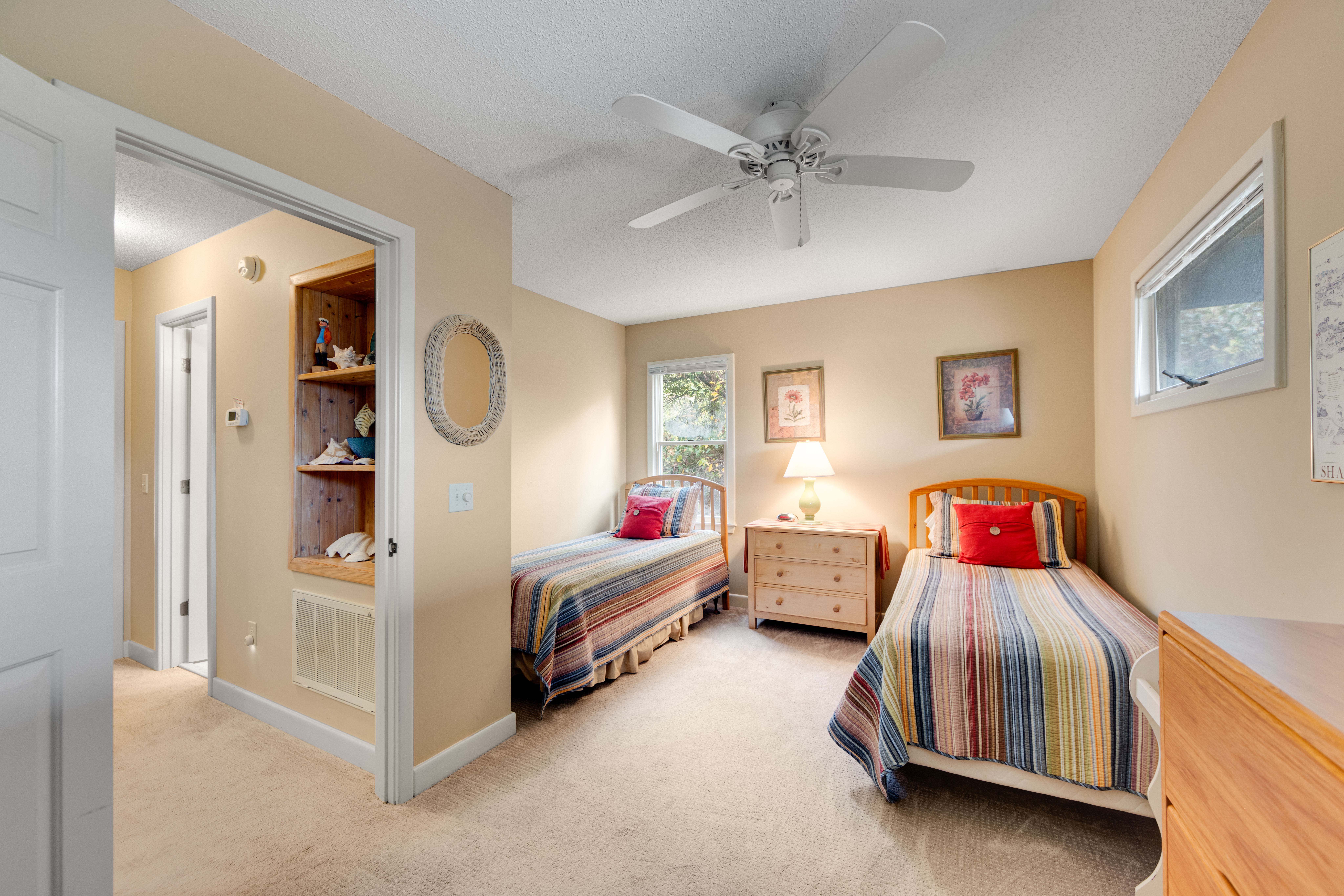 First Level: Bedroom with two twins, hall bathroom with shower/tub combo, queen bedroom with deck access, washer and dryer closet.