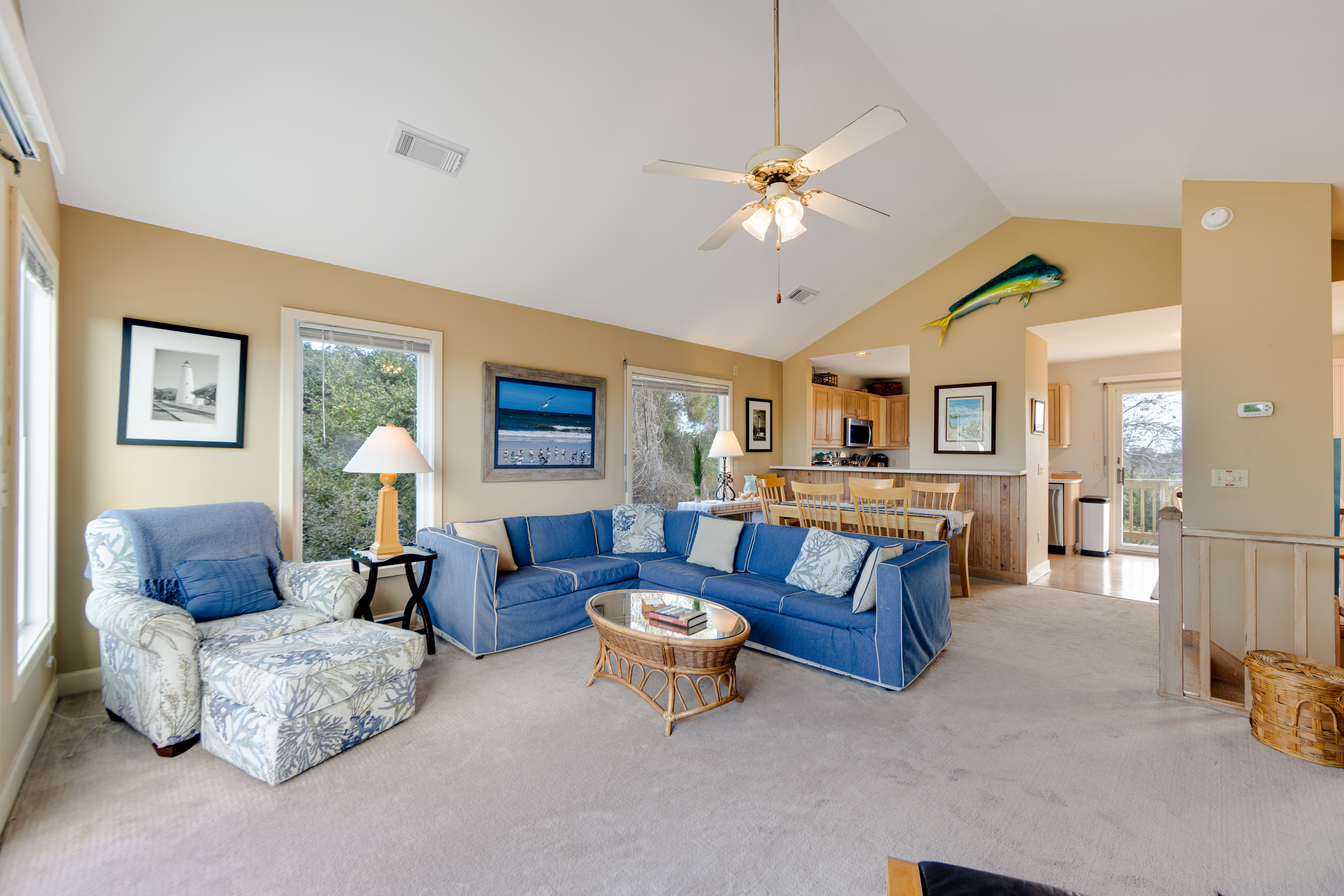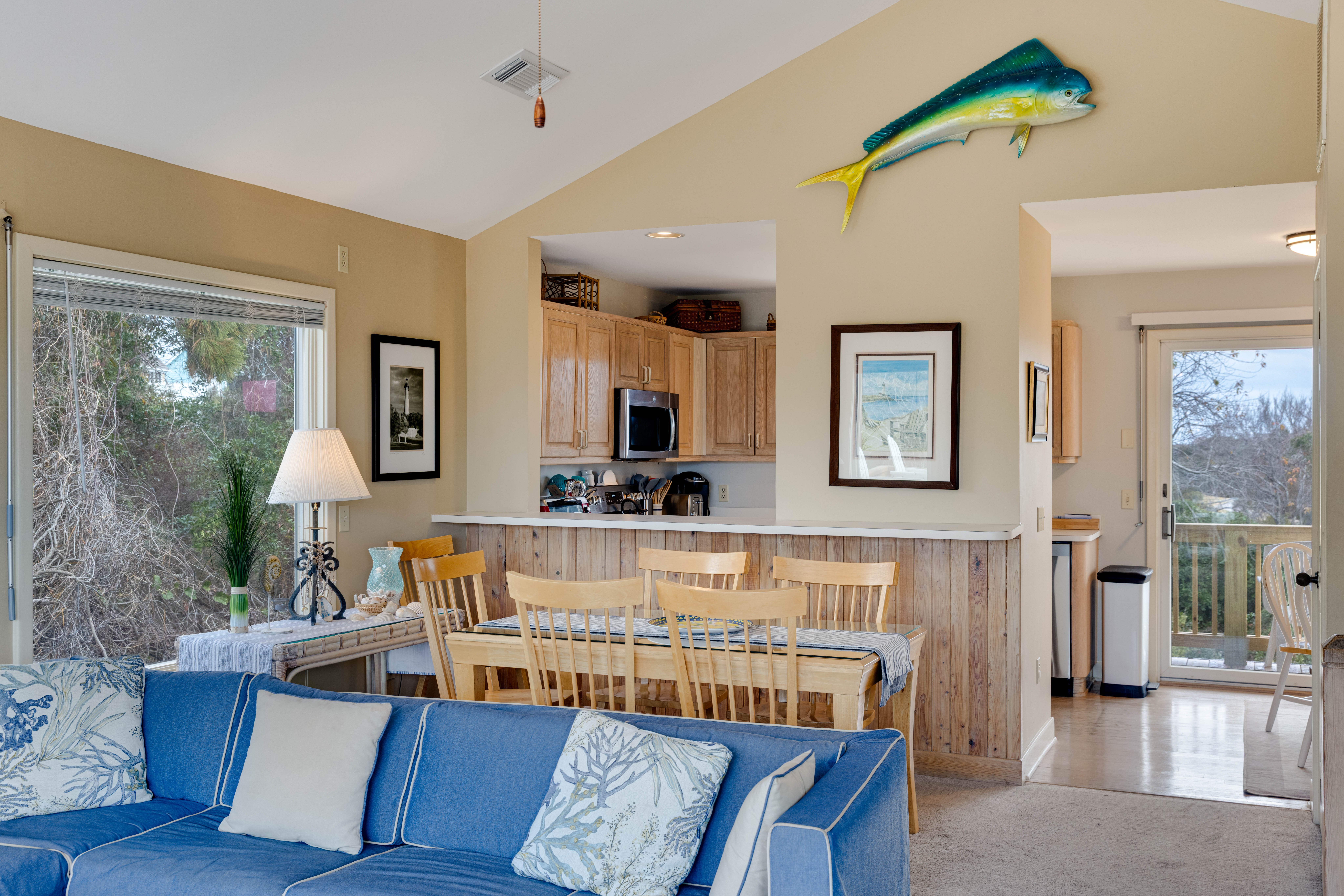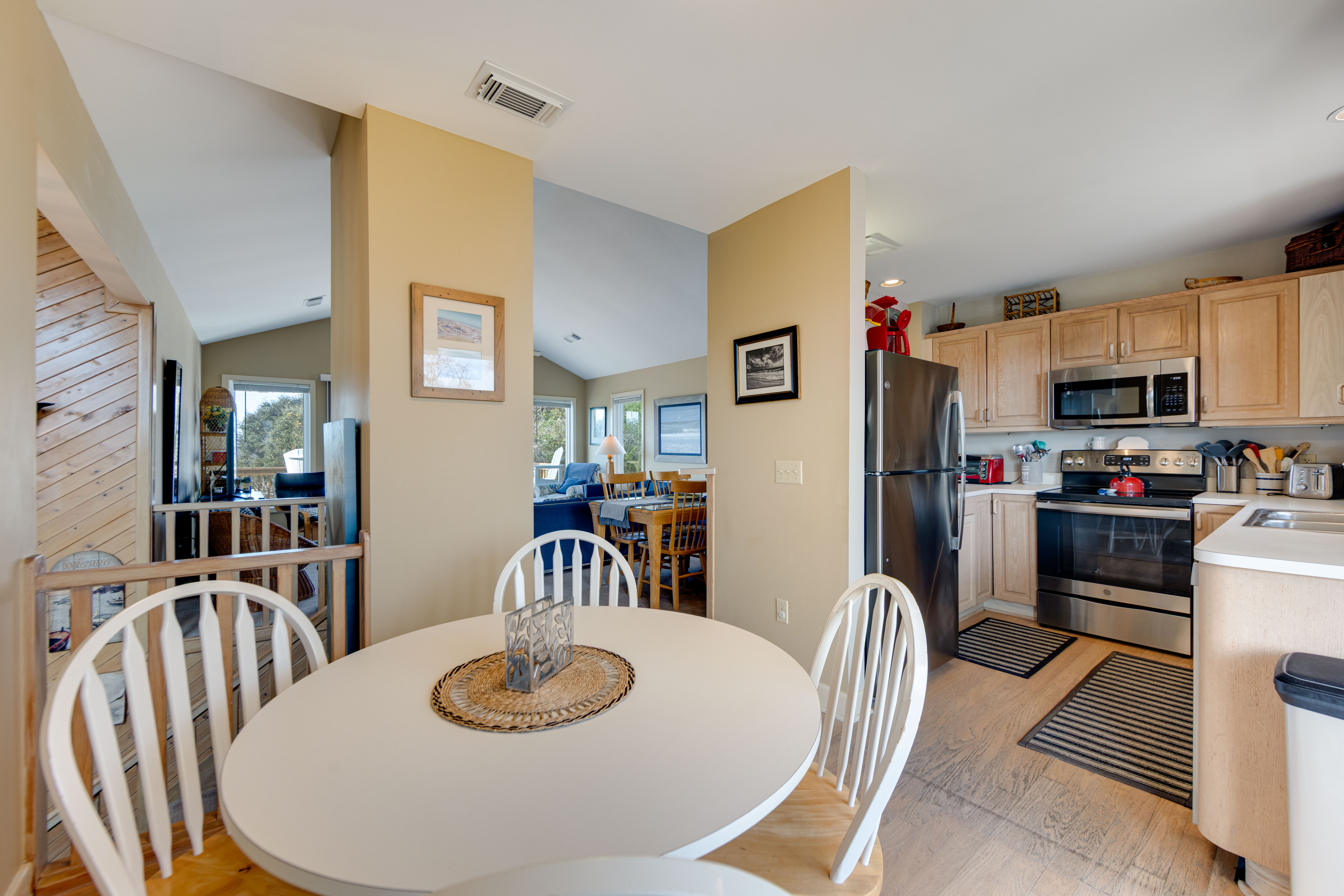 Marsh Tide Retreat is nestled along the greens of the Village at Nags Head Golf Links — a private, peaceful escape where the coastal breeze meets the calm rhythm of fairway life. This 3-bedroom, 2.5-bath gem is meticulously maintained and tastefully decorated, blending comfort and coastal style with an easygoing charm. The carport opens to a tranquil zen garden, setting the tone for the serenity that flows throughout the home.