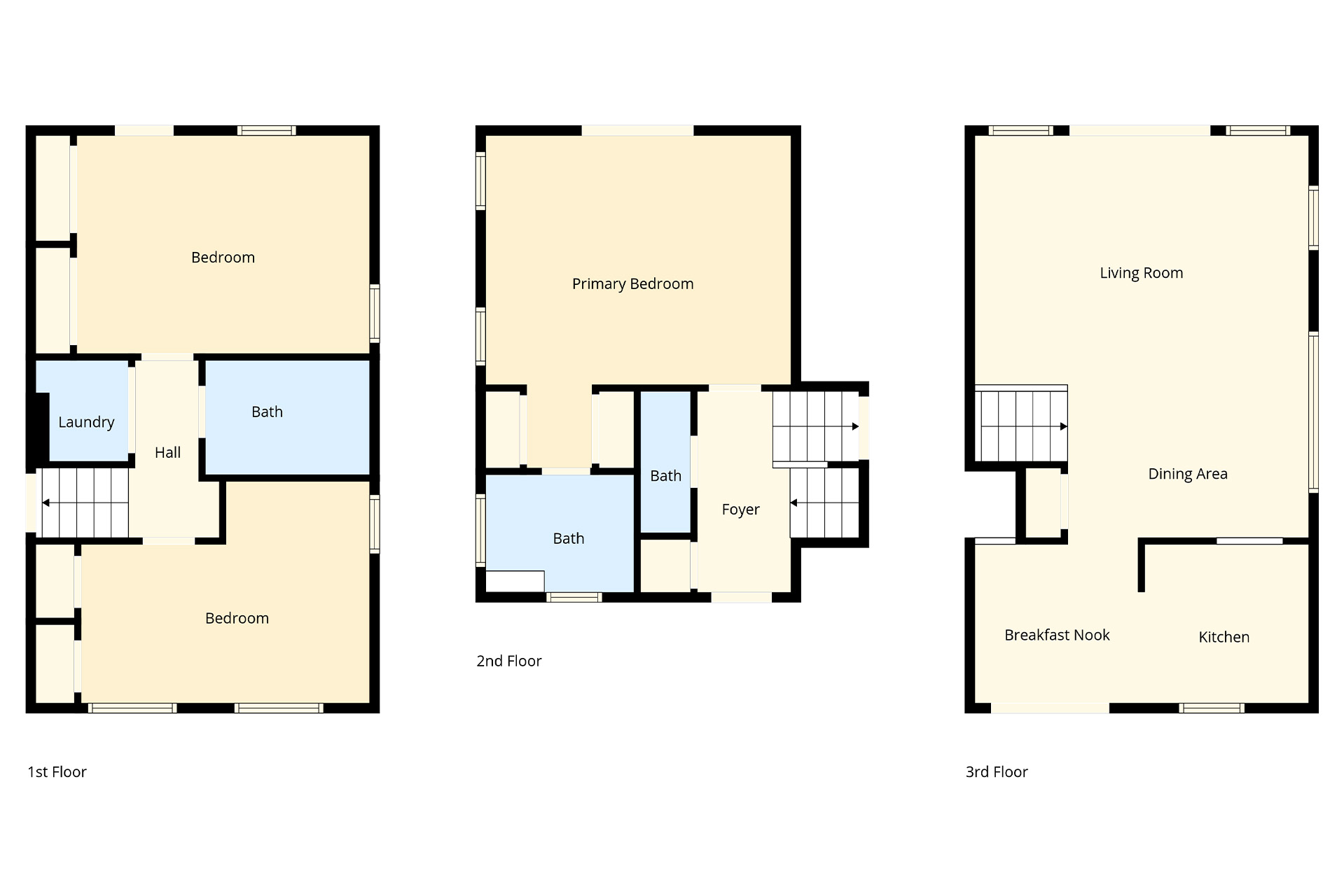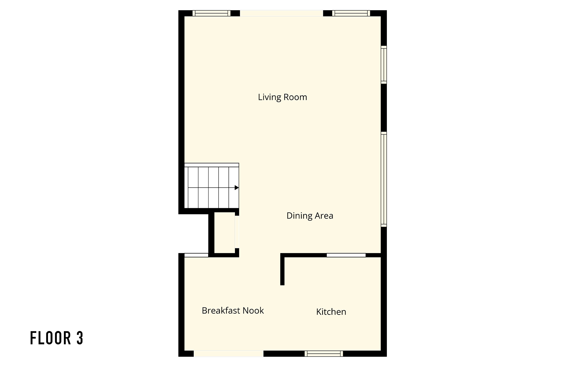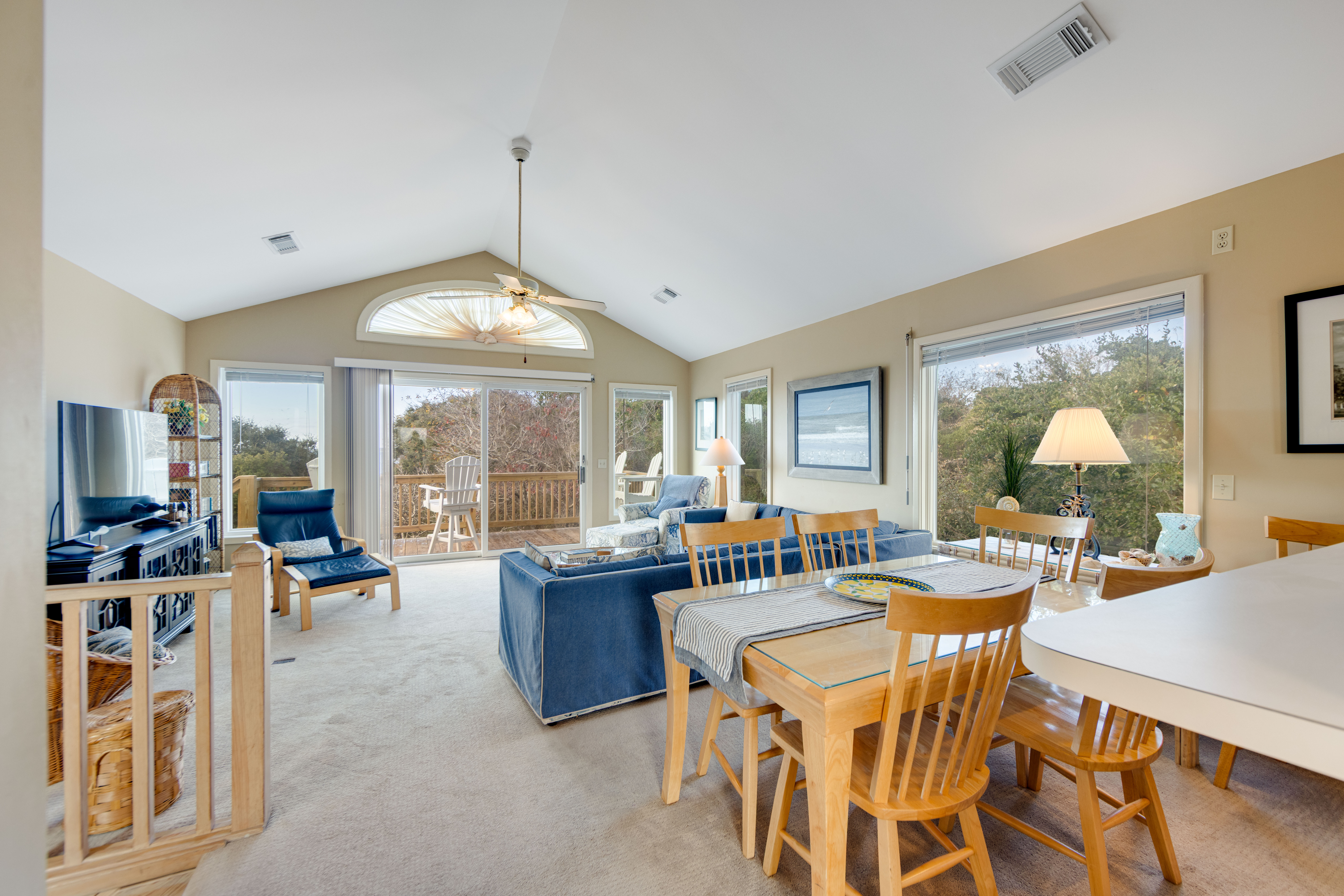 Third Level: Spacious living room, front and rear decks, dining table, kitchen with breakfast table.