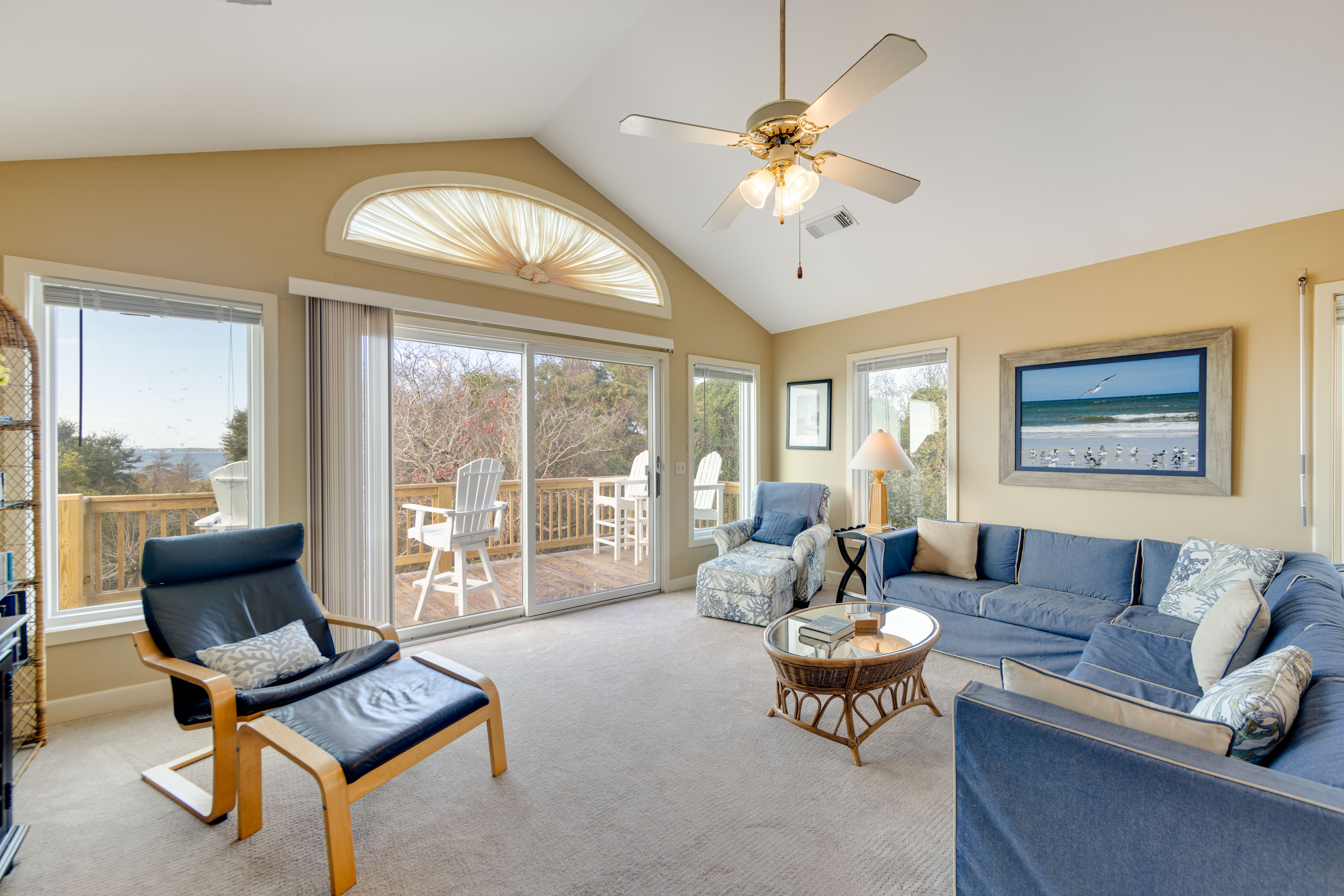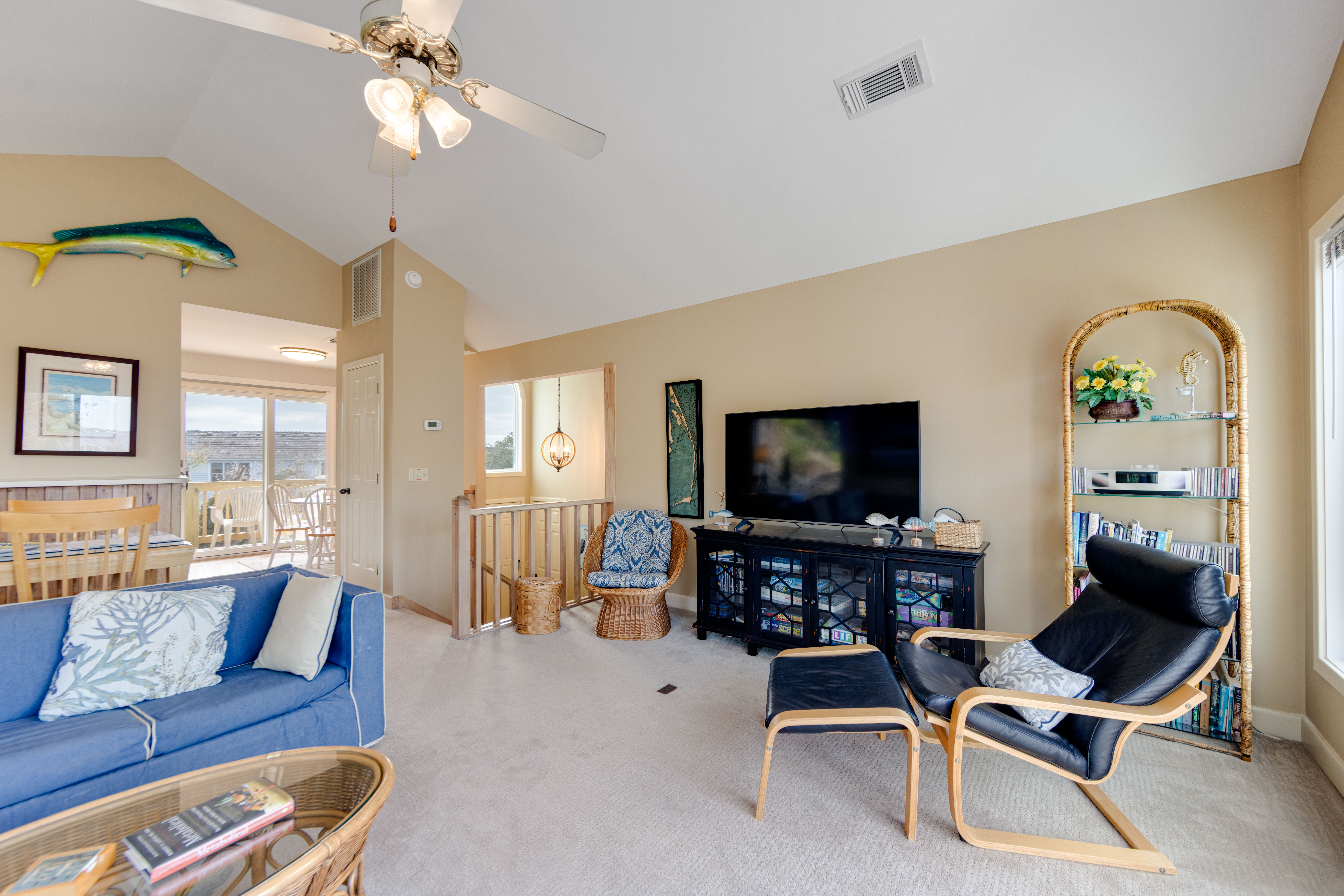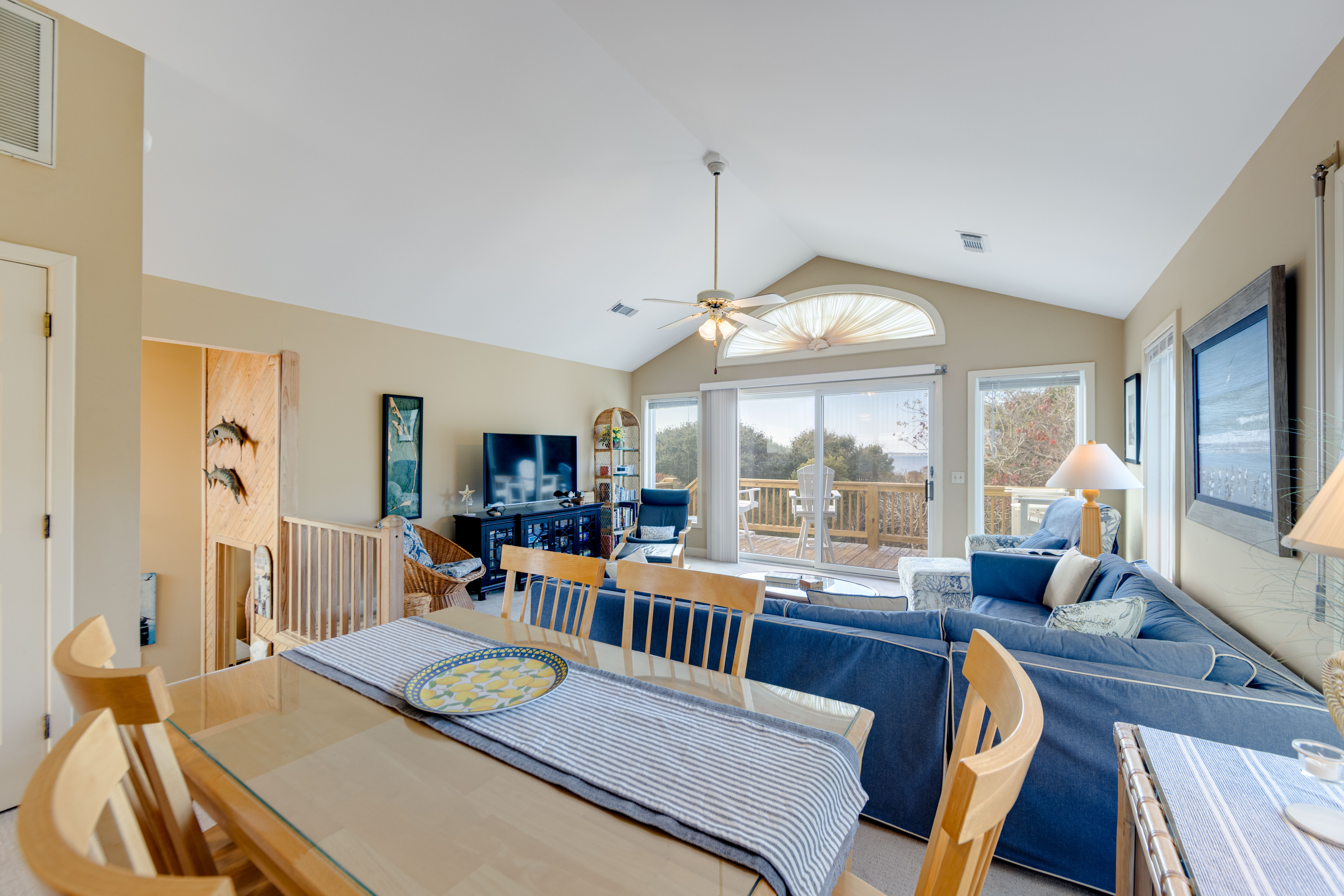 Inside, the layout offers privacy and flow. The first floor features a welcoming queen suite with an en suite bath and its own private deck, and a half bath in the hall. Step down to the lower level where you will find a second queen bedroom with deck access, and a twin bedroom perfect for kids or friends, all connected by a hall bath with a shower/tub combo. Upstairs, the bright and spacious living area with a large-screen TV opens onto a sound-facing deck — perfect for watching the sunset melt into the water or for golfers in the distance. A well-equipped kitchen with a breakfast table and a separate dining area makes gathering easy and relaxed.