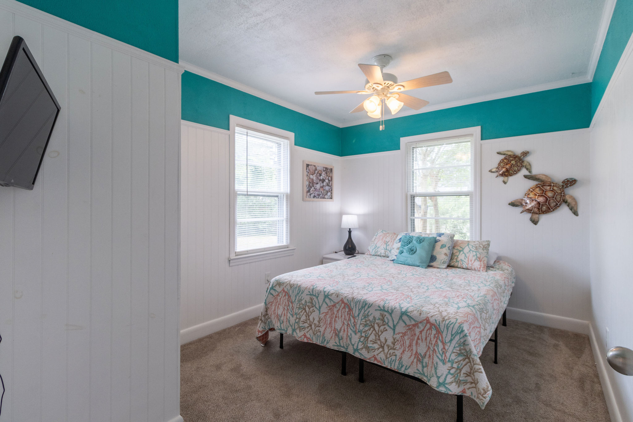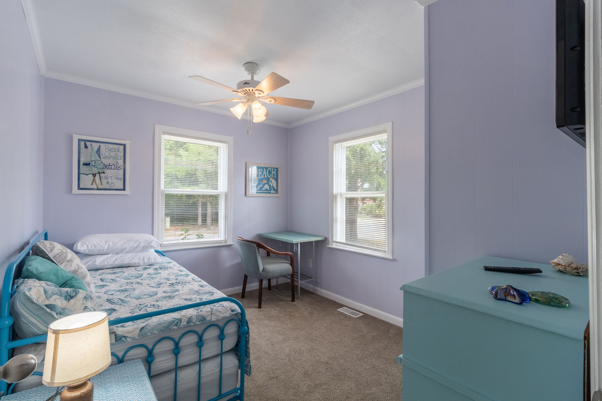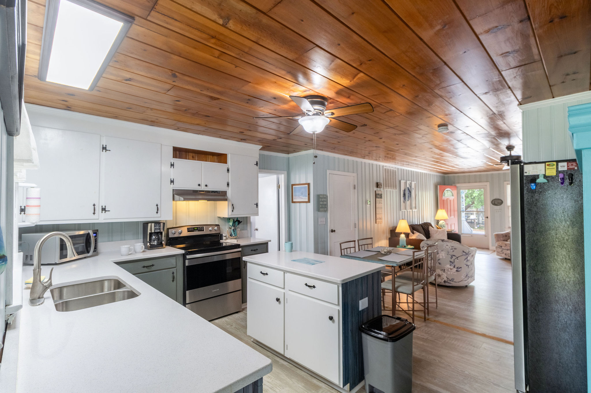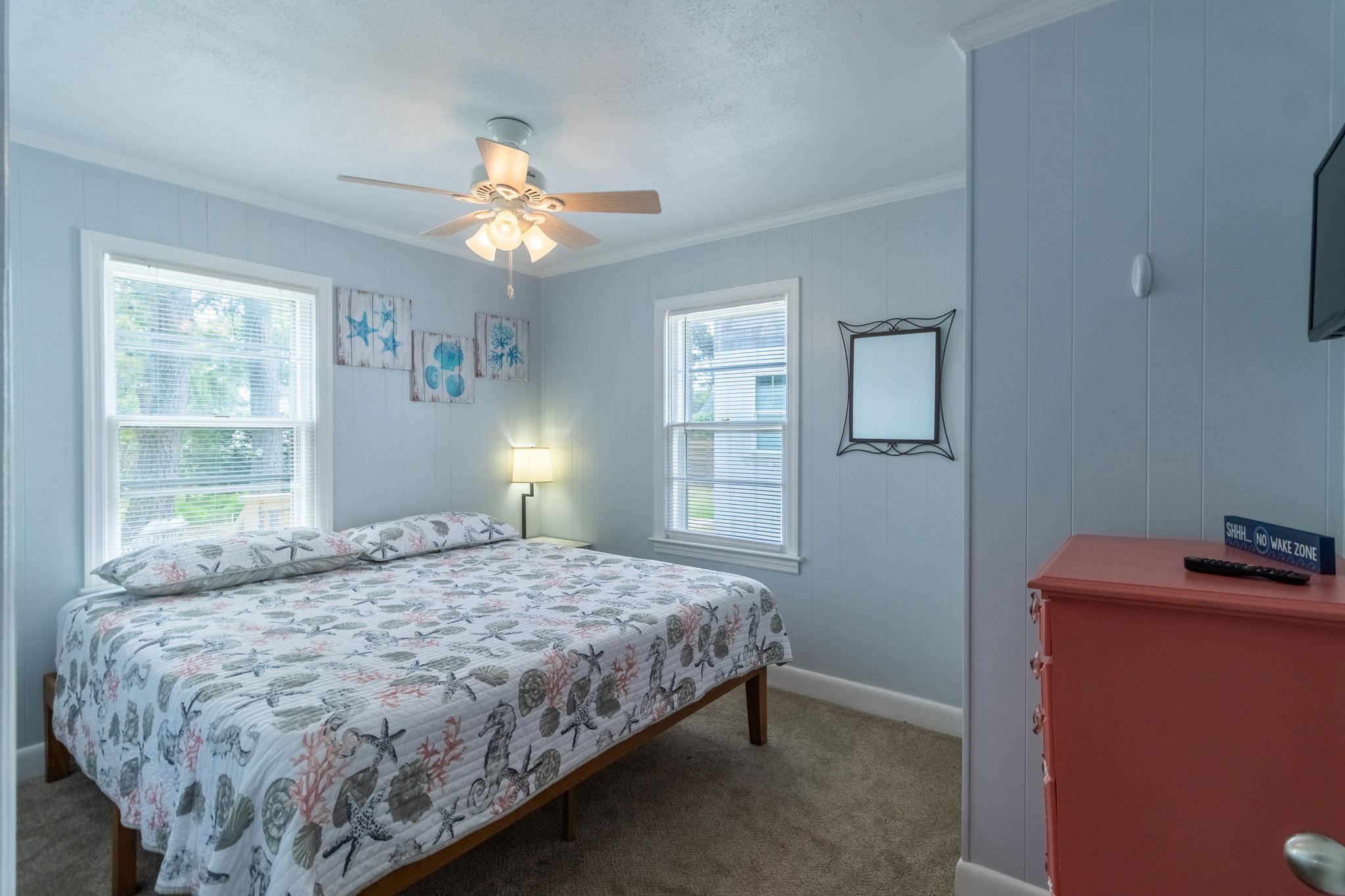 Step inside to find a thoughtfully laid-out interior featuring three cozy sleeping areas: a spacious King bedroom, a comfortable Queen bedroom, and a twin daybed with trundle—perfect for kids or extra guests. Two full hall bathrooms ensure there's plenty of space for everyone to refresh after a long day at the beach.