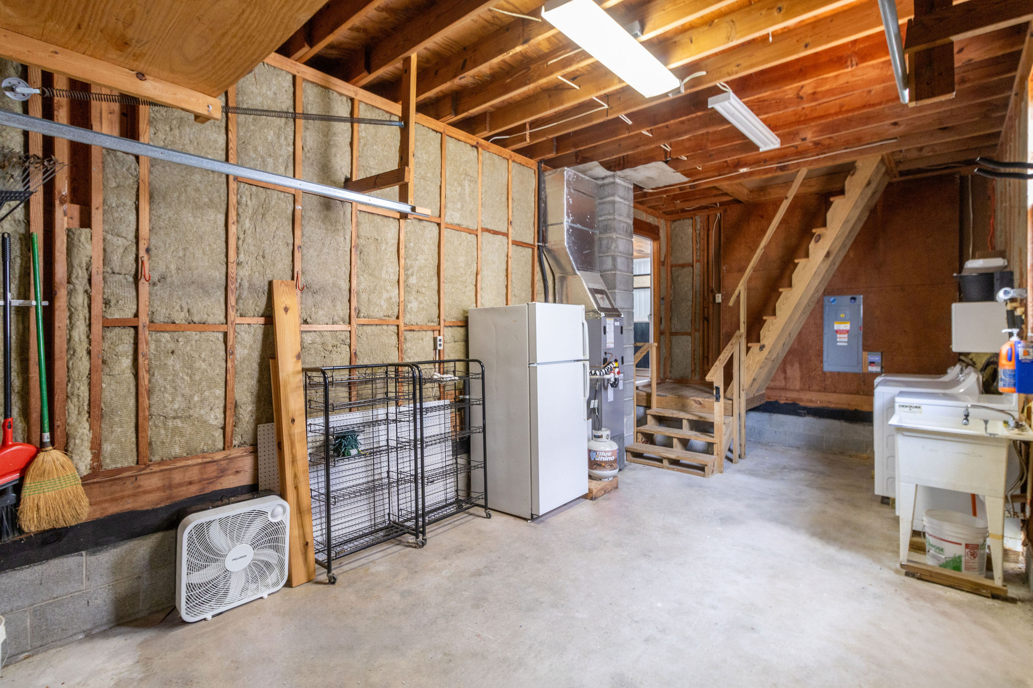 Ground Level: Open living area, dining, and kitchen, King bedroom and garage access on right of kitchen, queen bedroom, two hall baths, and bedroom with Twin and trundle to right—washer and Dryer located in garage.